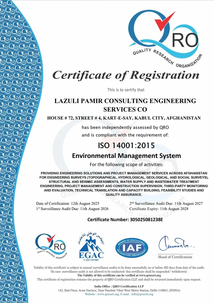 Lazuli Pamir Consulting Engineering Services Co. is officially certified under the ISO 14001:2015 Environmental Management System by Quality Research Organization (QRO), demonstrating our strong commitment to environmental protection, sustainability, and responsible engineering practices.